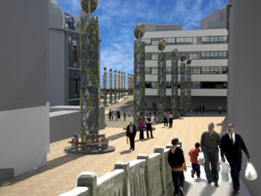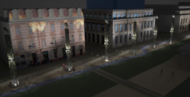 Del proyecto solo se menciona las Columnas que se proponen incorporar a la plaza en una doble “columnata” en reemplazo exigido por el encargo de la postación del alumbrado público y ornamental existente. Esta exigencia se considera regalo del encargo, al permitir crear un elemento hito que concentre funciones utilitarias, y multiplique relaciones espaciales entre el vacio de la plaza, el monumento, las fachadas, el cerro y el mar