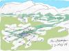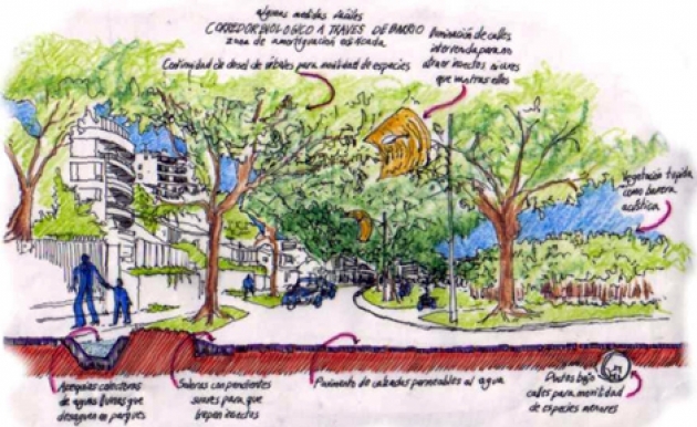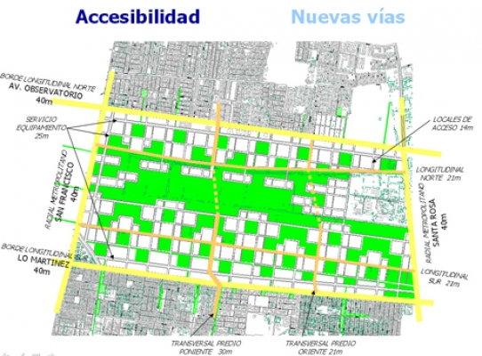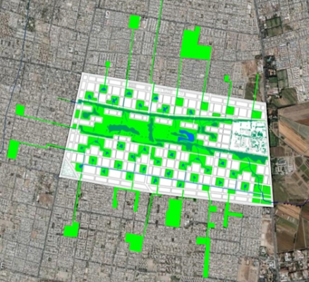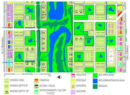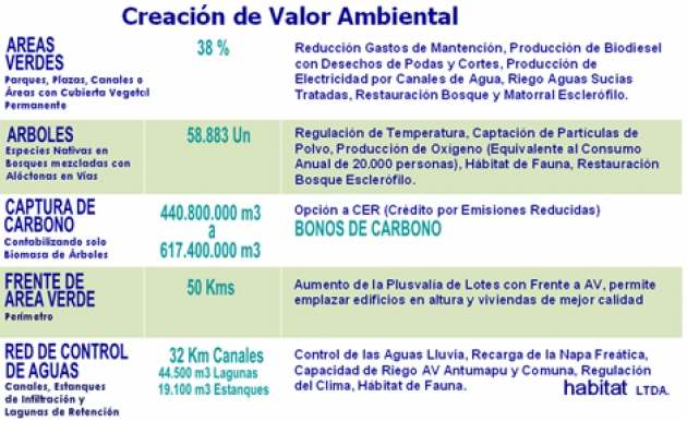 Básicamente se propone habitar en un ecosistema urbano de 330 ha donde todas las viviendas quedan con vista inmediata a una plaza de 1 manzana y a 3 cuadras máximas de un parque de 100 has. Las áreas verdes se desarrollan en base a una red de canales de riego y lagunas de retención de aguas lluvias, que permiten mantener una cobertura verde nativa importante a través de todo el año, regando inclusive muchas áreas verdes externas de la comuna. |
