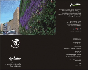 Asistimos como oficina al evento realizado el Jueves 25 de Noviembre a las 11:00 horas en las dependencias del Hotel Radisson diseñado por el arquitecto Harken Jensen, las que fueron inauguradas a mediados de este año, estas incorporan un muro verde de 20 x 15 metros abarcando tres niveles, con un diseño de la vegetación en tramas sinuosas, diseñado por la paisajista Mitzi Rojas y Mariana Guzmán .