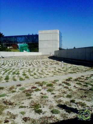 Consiste en una Cubierta Vegetal extensiva ecológica de 300 m2 aproximadamente, emplazada sobre el techo de la plaza interior entre los dos edificios. Se utilizó sedum en 3 variedades para colorear un diseño de vetas rojas y verdes visible desde el entorno, sobre el sistema tecnologico Floradrain FD25 de Zinco.